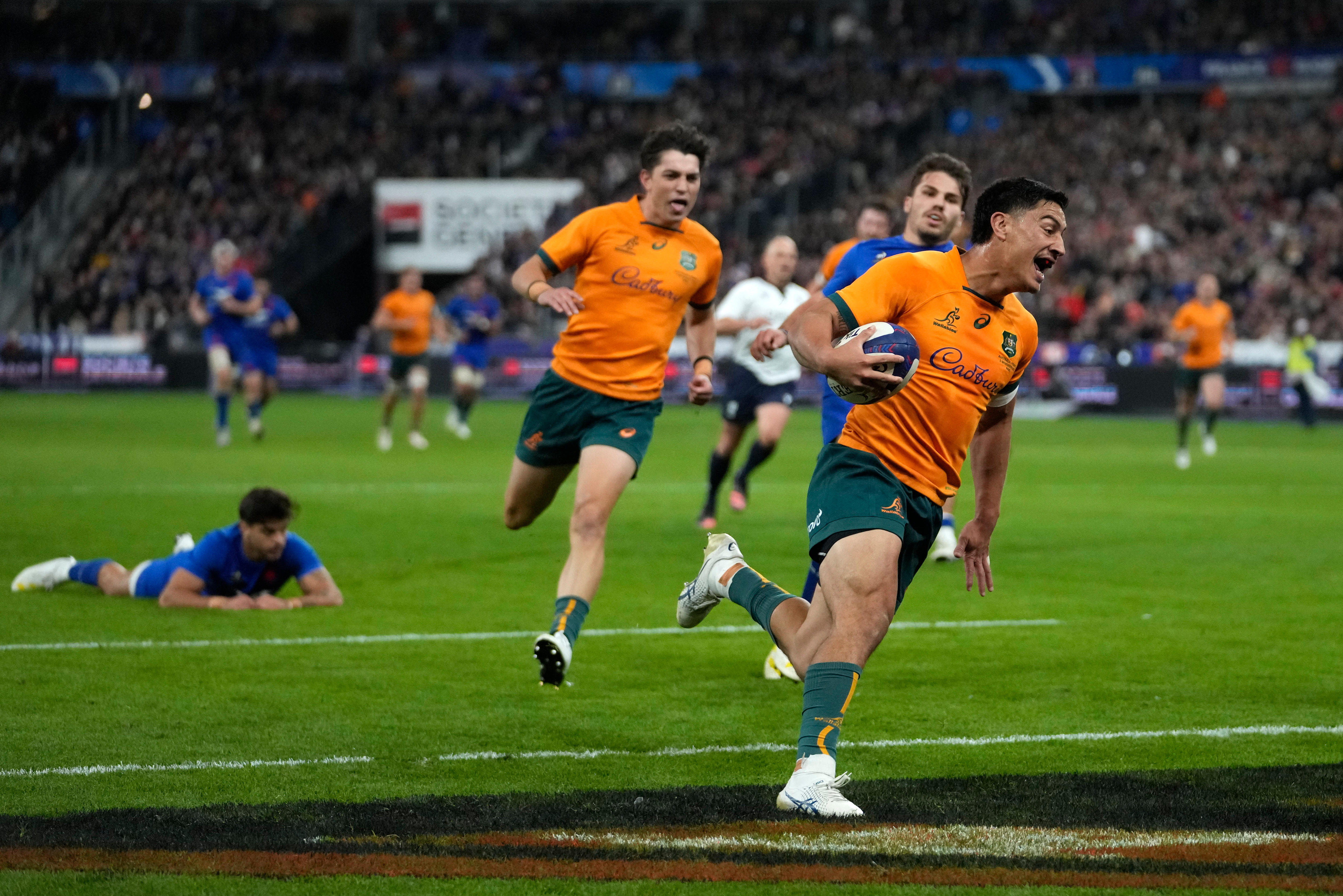 Aussie fullback strikes in first start. Frances wing Damian Penaud L celebrates scoring the match-winner at Stade de France on November 5. The 33-30 result was massive for the Wallabies as Les Bleus are currently the World Cup favourites for the 2023 World Cup in France.
